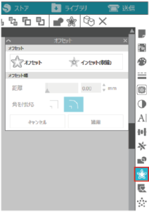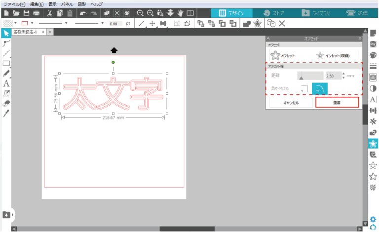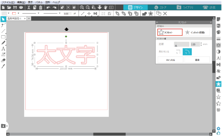 - テキストを選択した状態で [オフセット] ボタンをクリックすると、テキストの周りにカットラインが表示されます。