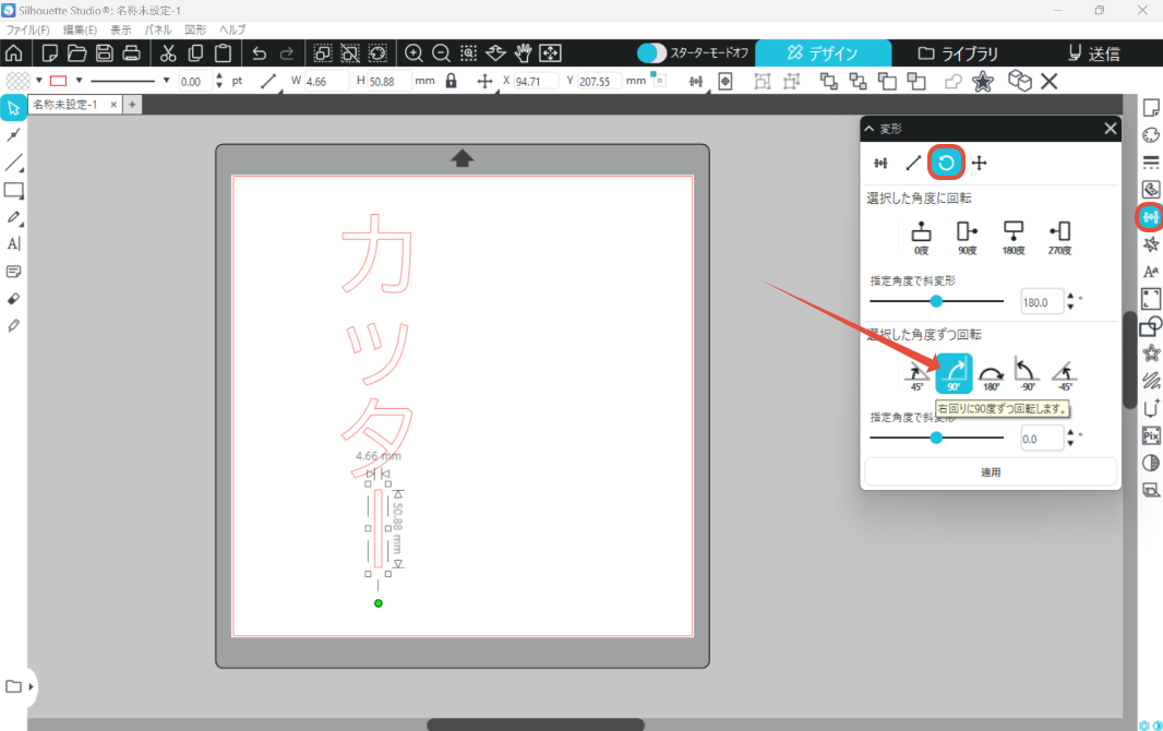 2. [変換]パネルの[回転]タブを開き、「ー」の文字を90度回転させます。