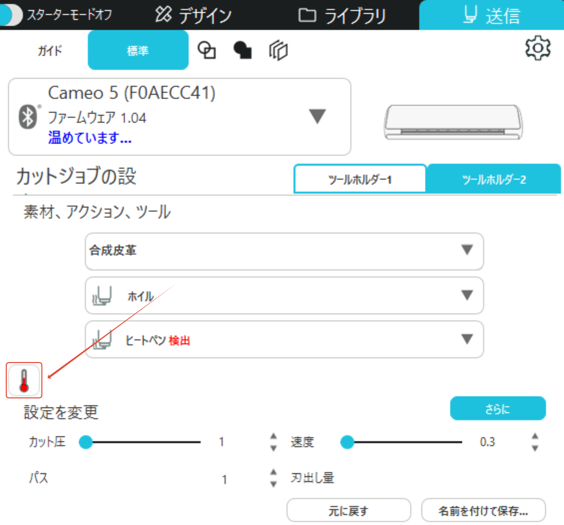 ランプが点灯していない場合はソフトウェアの「送信」タブで加熱ボタンをクリックし、ヒートペンを温めてください。