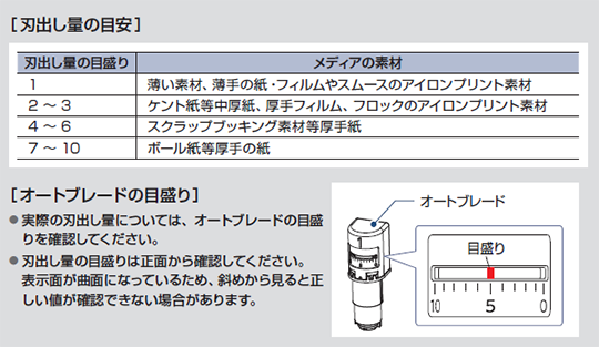 カットするメディアの厚みより若干多く刃が出るように設定してください。