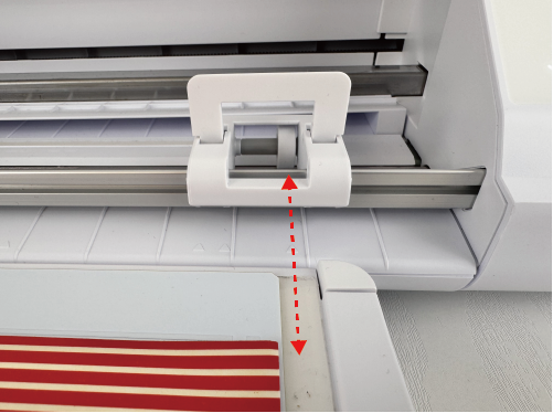 - 右側のピンチローラーユニットレバーを上げ、静電マット両側の透明なフィルム(ローラーガードテープ)の上にピンチローラーが乗るように移動します。